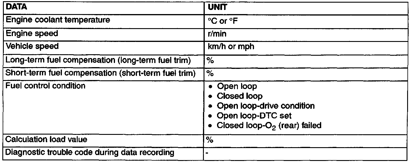 The 61 diagnostic items are all indicated sequentially from the smallest code number. The PCM records the engine operating condition when the diagnostic trouble code is set. This data is called "freeze frame" data. This data can be read by using the scan tool, and can then be used in simulation tests for troubleshooting. Data items are as follows.
