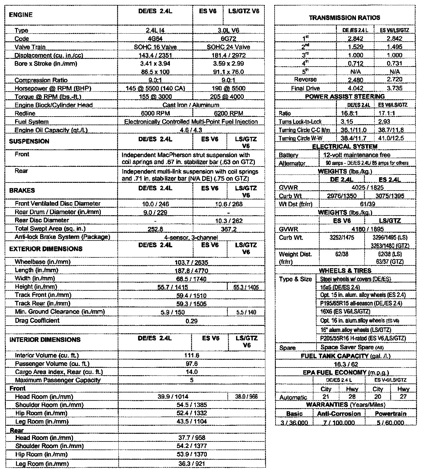2001 GALANT TECHNICAL SPECIFICATIONS