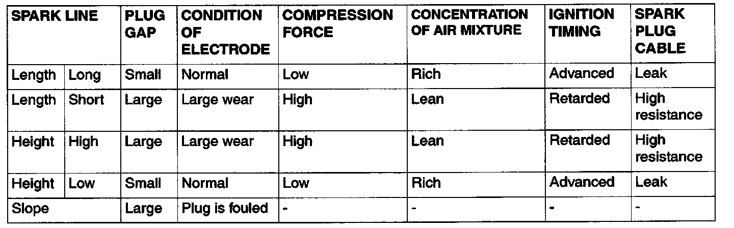 The height, length and slope of the spark line (refer to abnormal waveform examples 1, 2, 3 and 4) show the following trends.