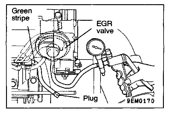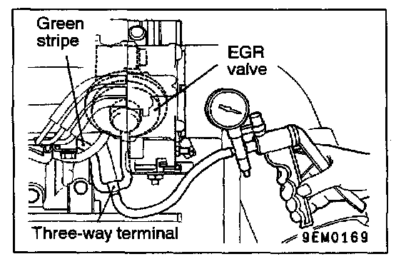 1. Disconnect the vacuum hose (green stripe) from the EGR valve, and then connect a hand vacuum pump via the three-way terminal.
