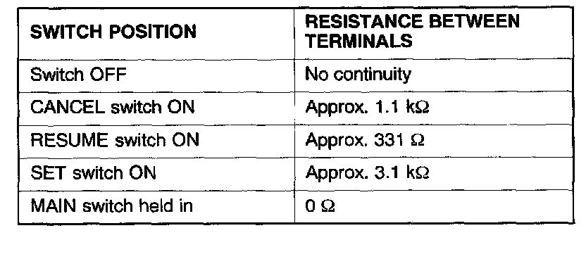 Measure the resistance between the terminals when each of the SET, RESUME and CANCEL switches is pressed. If the values measured at this time correspond to those in the table, then there is no problem.