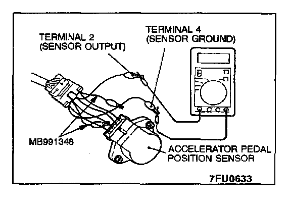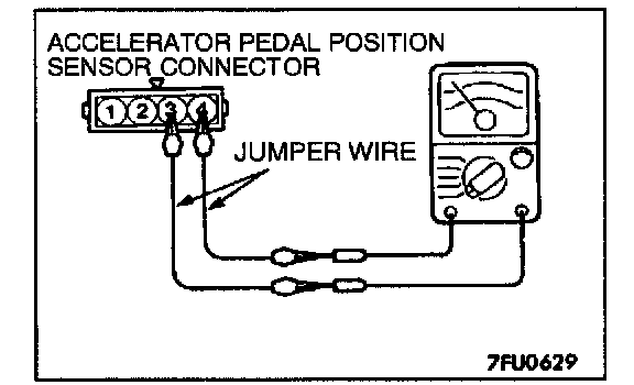 1. Disconnect the accelerator pedal position sensor connector and connect the special tool (test harness: MB991348) in between.