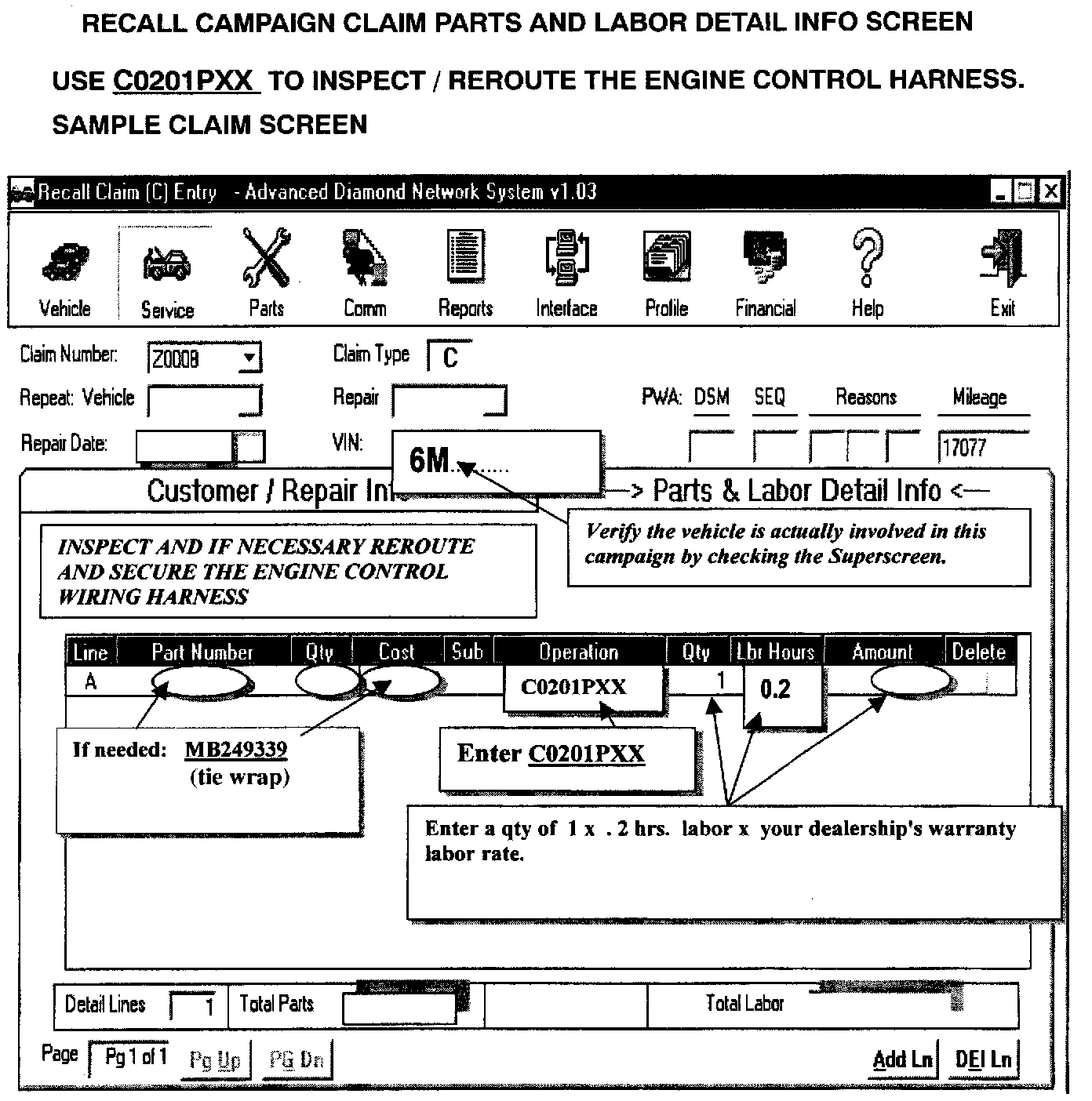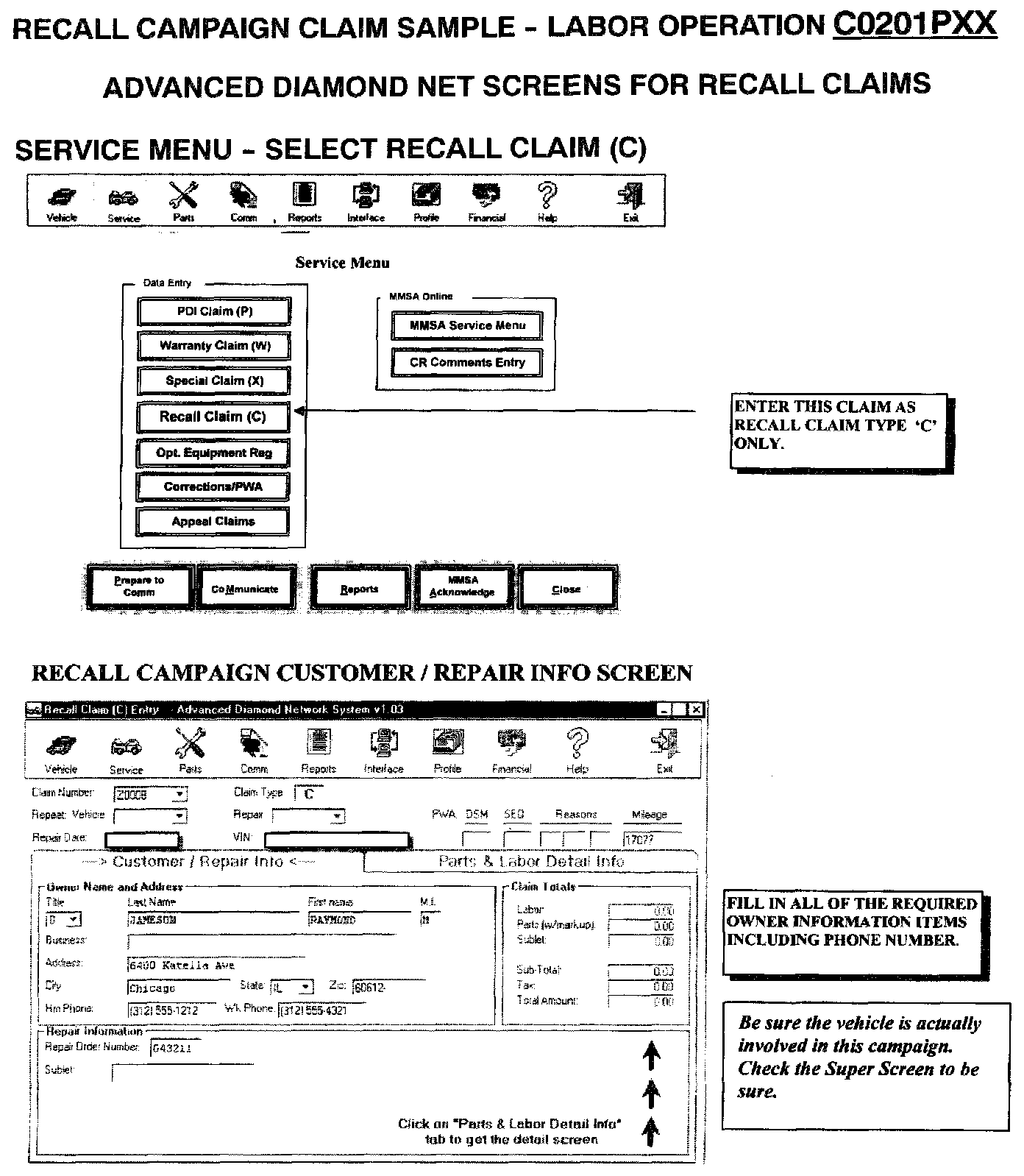 Claims for this campaign must be entered as Recall type "C" claims on your Diamond Network Service Menu. Sample claim screens are shown.