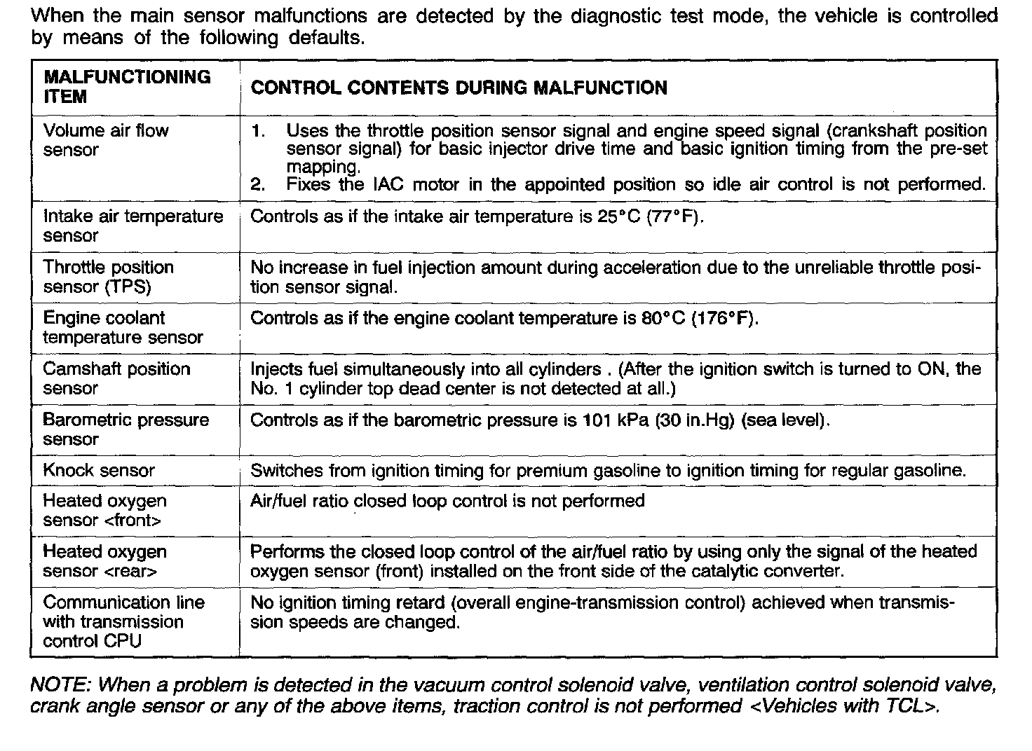 Fail-Safe/Backup Function Table:
