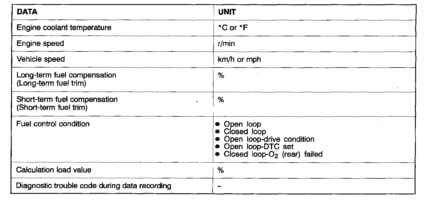 This data can be read by using the scan tool, and can then be used in simulation tests for troubleshooting. Data items are as above.
