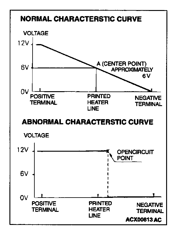 2. Turn "ON" rear window defogger switch. Measure heater element voltage with circuit tester at rear window glass centre A. Condition is good if it indicates about 6 V.