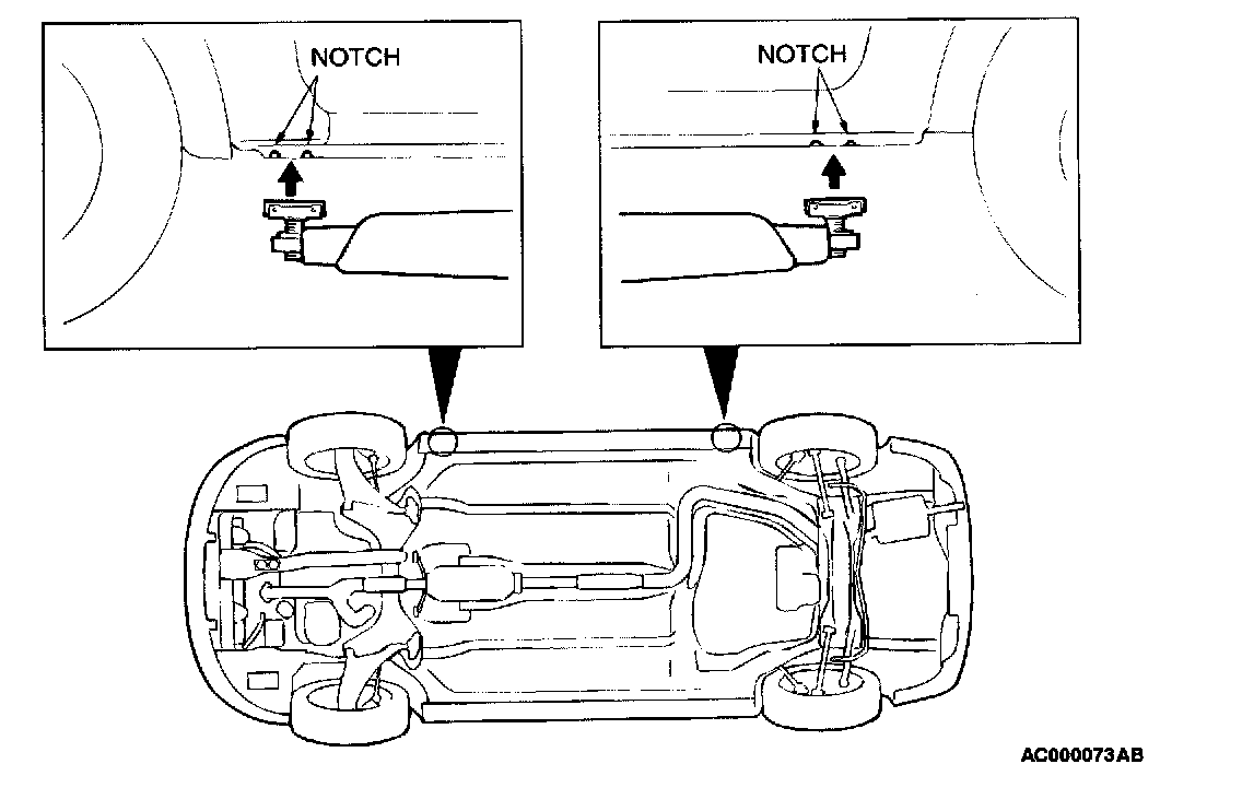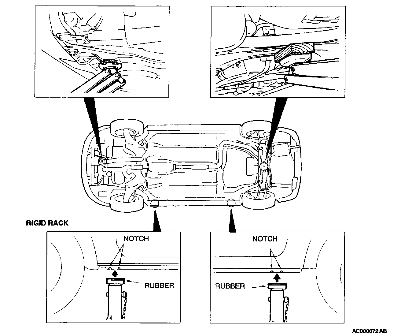 CAUTION: Never support any point other than the specified one, or that point will be deformed. For lifting, put rubber or similar material between the side sill and rigid rack, or the side sill area will be damaged.