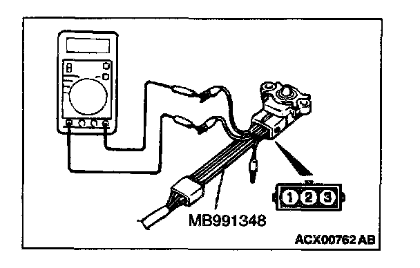 1. Disconnect the fuel tank differential pressure sensor connector and connect special tool MB991348 between the terminals of the disconnected connector.