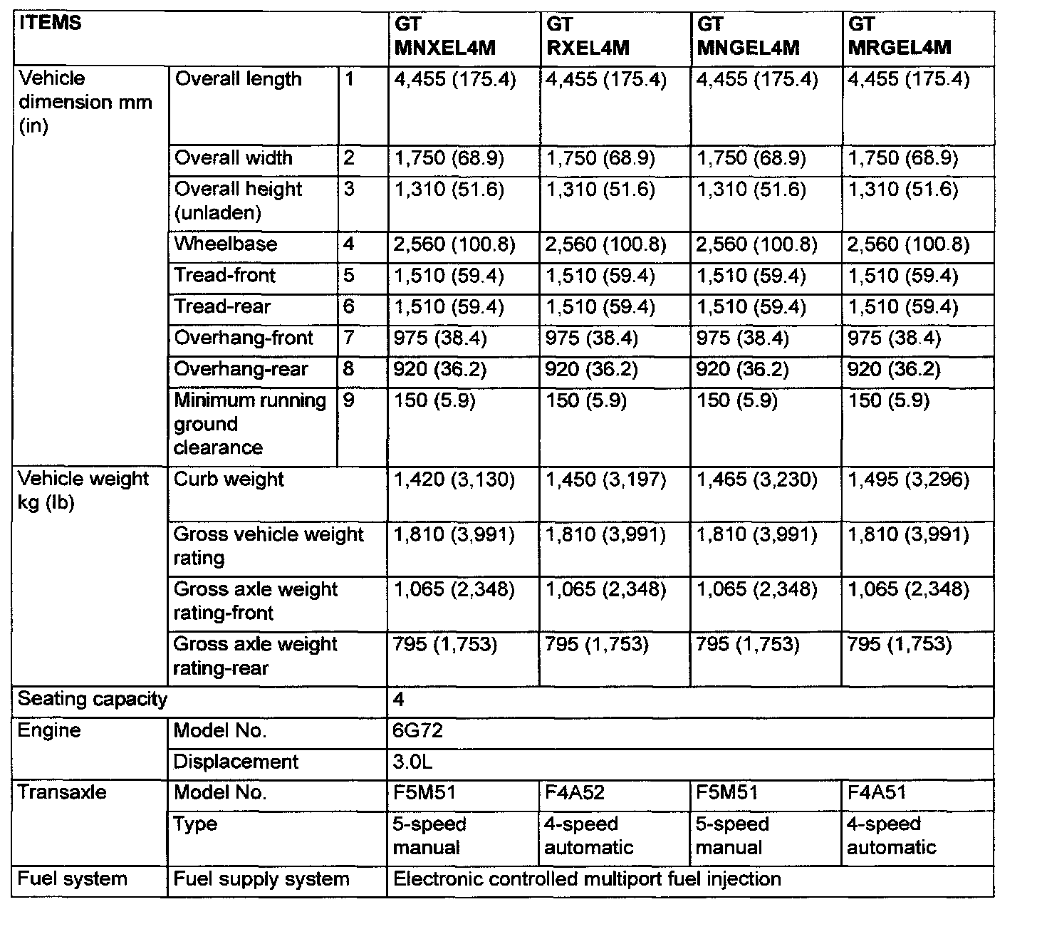 General Specifications (Model With 3.0L Engine):