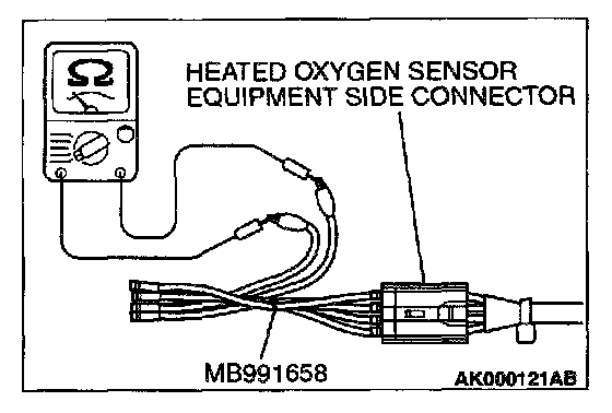 1. Disconnect the heated oxygen sensor connector and connect special tool MB991658 to the connector on the heated oxygen sensor side.