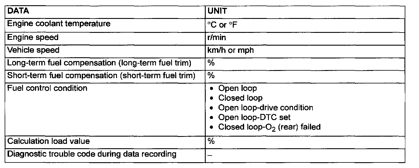 NOTE: If the sensor connector is disconnected with the ignition switch turned on, the diagnostic trouble code is memorized. In this case, send the diagnostic trouble code erase signal to the PCM in order to erase the diagnostic memory The 79 diagnostic items are all indicated sequentially from the smallest code number The PCM records the engine operating condition when the diagnostic trouble code is set. This data is called "Freeze-frame" date. This data can be read by using the scan tool, and can then be used in simulation tests for troubleshooting. Data items are as follows: