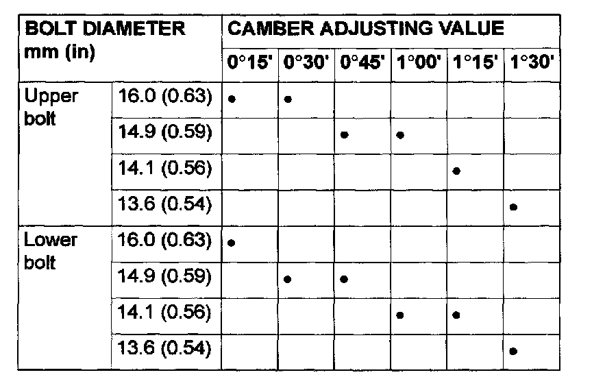 NOTE: the camber adjusting value that is required is greater than 1° 30', check for bent or damaged parts and replace as necessary. Bolts are identified in the following table: