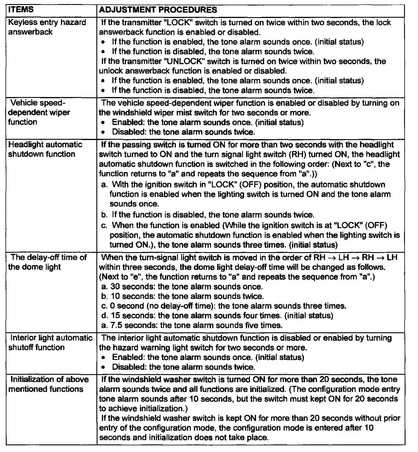 NOTE: The keyless entry hazard answerback can be also adjusted by operating the RKE transmitter, (however, this adjustment can be done more easily by operating the transmitter.) Refer to Keyless Entry System - On- vehicle Service - Enabling/disabling the Answerback Function.
