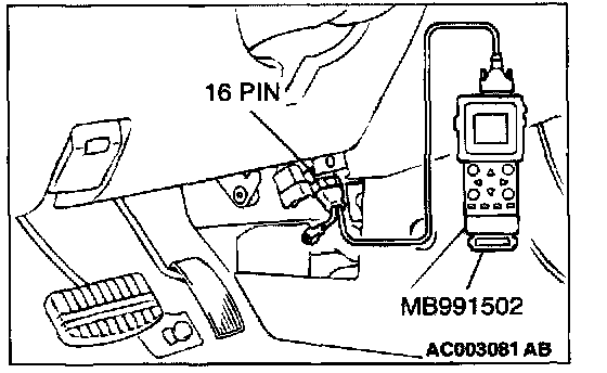 CAUTION: To prevent damage to scan tool MB991502, always turn the ignition switch to the "LOCK" (OFF) position before connecting or disconnecting scan tool MB991502.