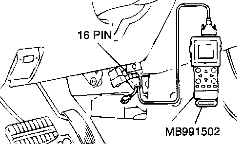 CAUTION: To prevent damage to scan tool MB991502, always turn the ignition switch to the "LOCK" (OFF) position before connecting or disconnecting scan tool MB991502.