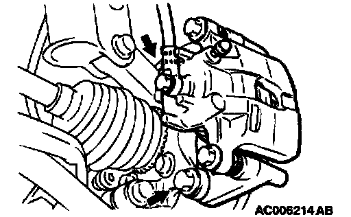 2. Remove the slide pin bolt. Pivot the caliper assembly and hold it with wires.