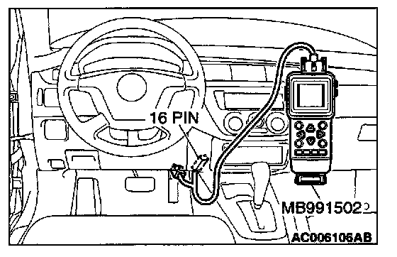CAUTION: To prevent damage to scan tool MB991502, always turn the ignition switch to the "LOCK" (OFF) position before connecting or disconnecting scan tool MB991502.