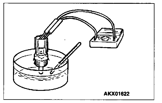 2. With the temperature sensing portion of engine coolant temperature sensor immersed in hot water, check the resistance.