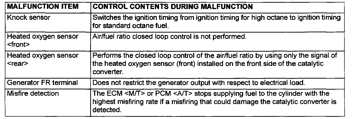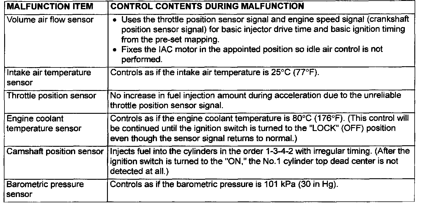 When the main sensor malfunctions are detected by the diagnostic test mode, the vehicle is controlled by means of the following defaults.