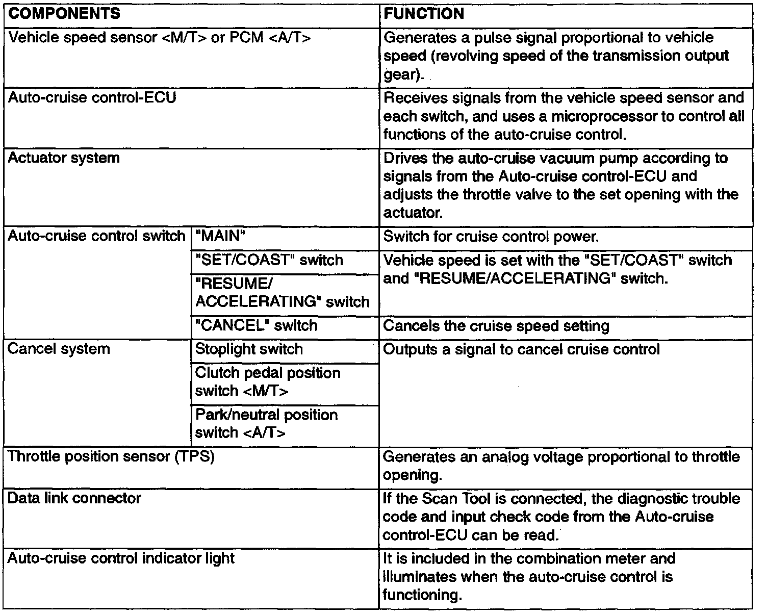 Basically the system is the same as the previous type, but on A/T models the power control module (PCM) sends a vehicle signal to the auto-cruise control- ECU.