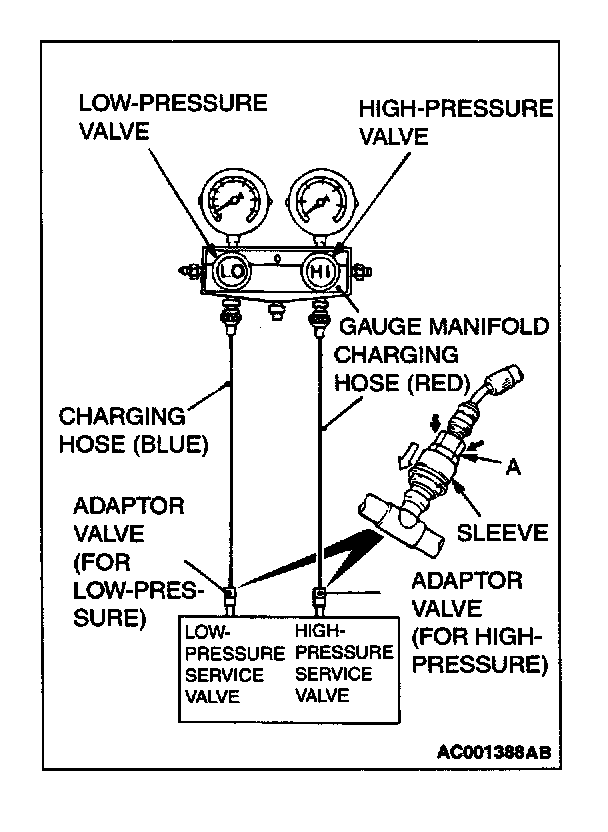 NOTE: The high-pressure service valve is on A/C pipe and the low-pressure service valve is on the suction hose.