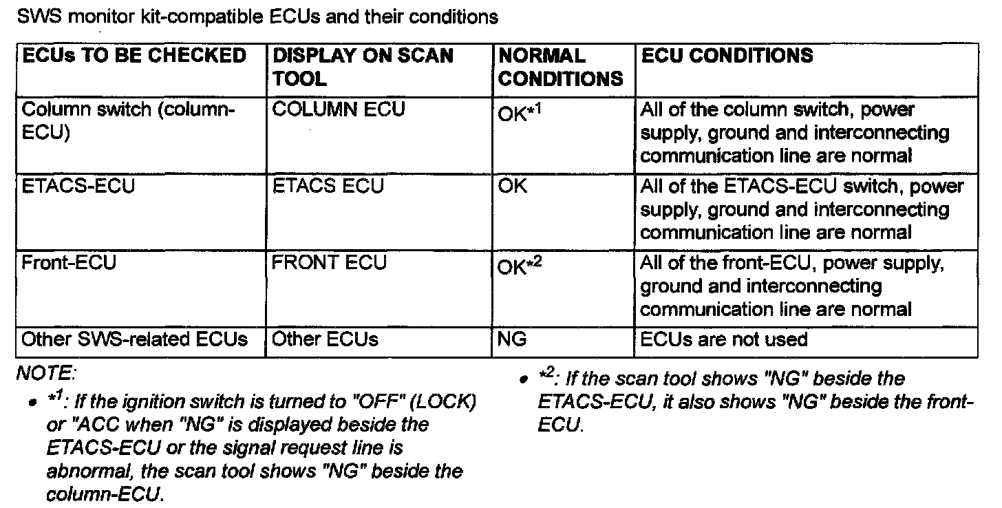 1. Use the scan tool and the SWS monitor kit to check ECUS. (Refer to MUT-II Reference Manual)2. The following ECUs can be checked by using the scan tool and the SWS monitor kit.