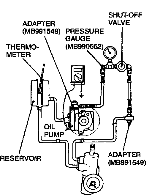 1. Disconnect the pressure hose from the oil pump, and then connect special tools MB991548, MB990662 and MB991549.