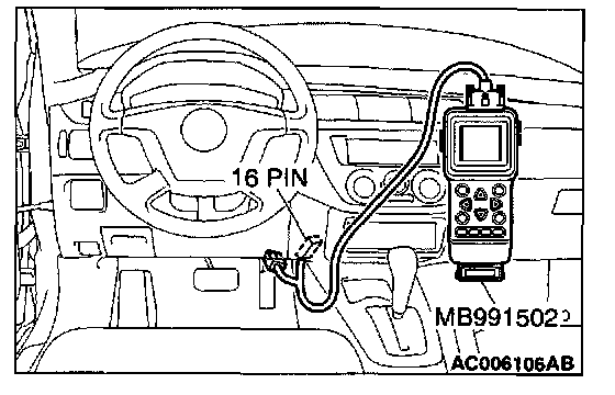 CAUTION: To prevent damage to scan tool MB991502, always turn the ignition switch to the "LOCK" (OFF) position before connecting or disconnecting scan tool MB991502.