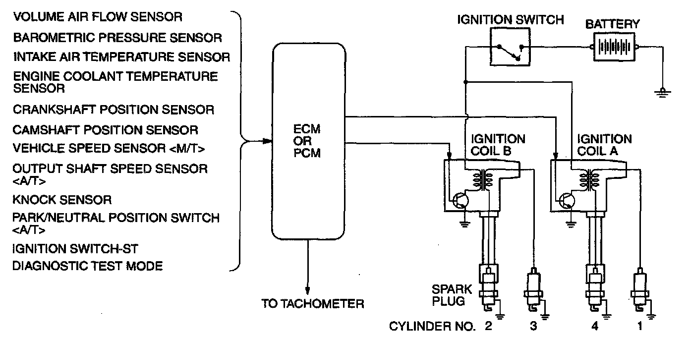 This system is provided with two ignition coils (A and B) with built-in ignition power transistors for the number 1 and number 4 cylinders, and number 2 and number 3 cylinders respectively.