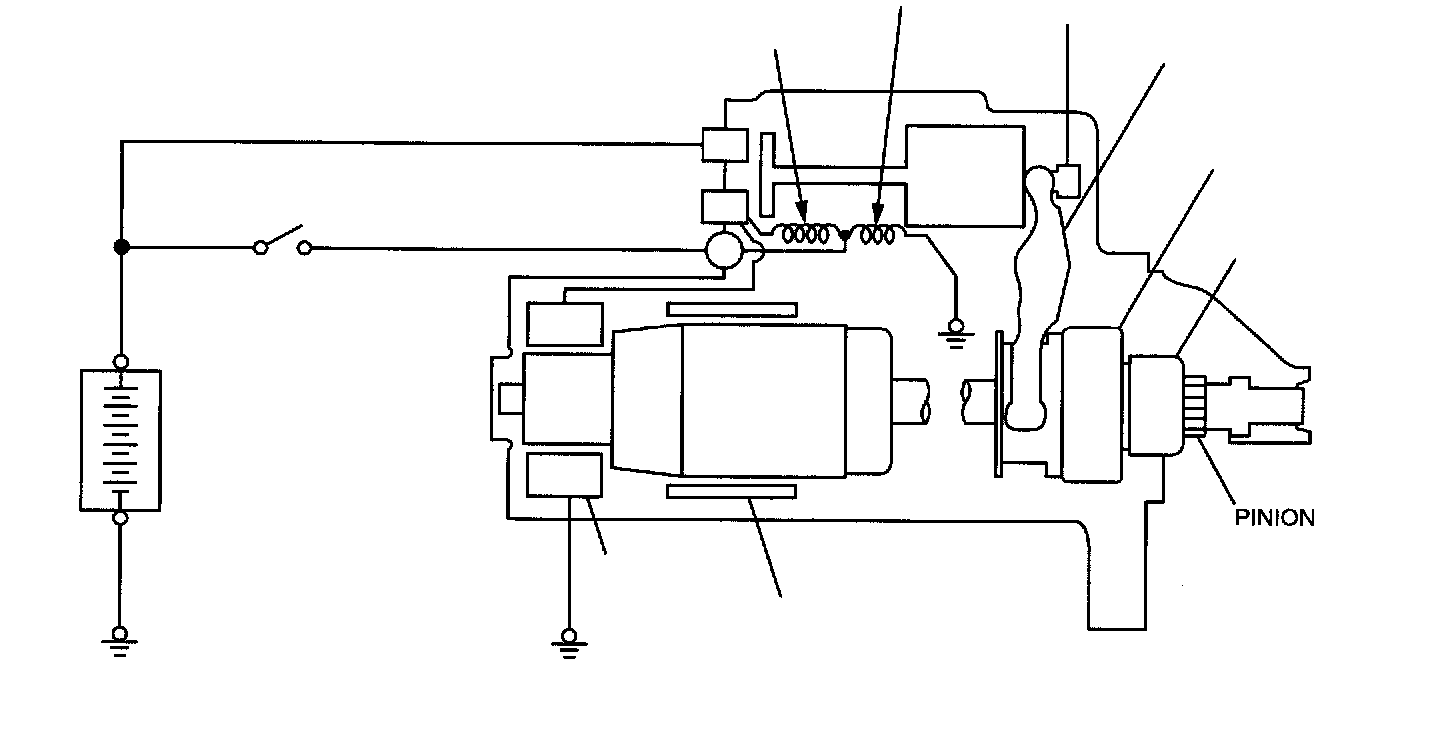 If the ignition switch is turned to the "START" position, current flows in the coil provided inside magnetic switch, attracting the plunger. When the plunger is attracted, the lever connected to the plunger is actuated to engage the overrunning clutch with the ring gear.