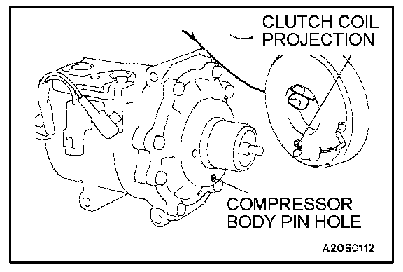 When installing the clutch coil to the A/C compressor body, install so that the pin hole of the A/C compressor body and the clutch coil projection are aligned.