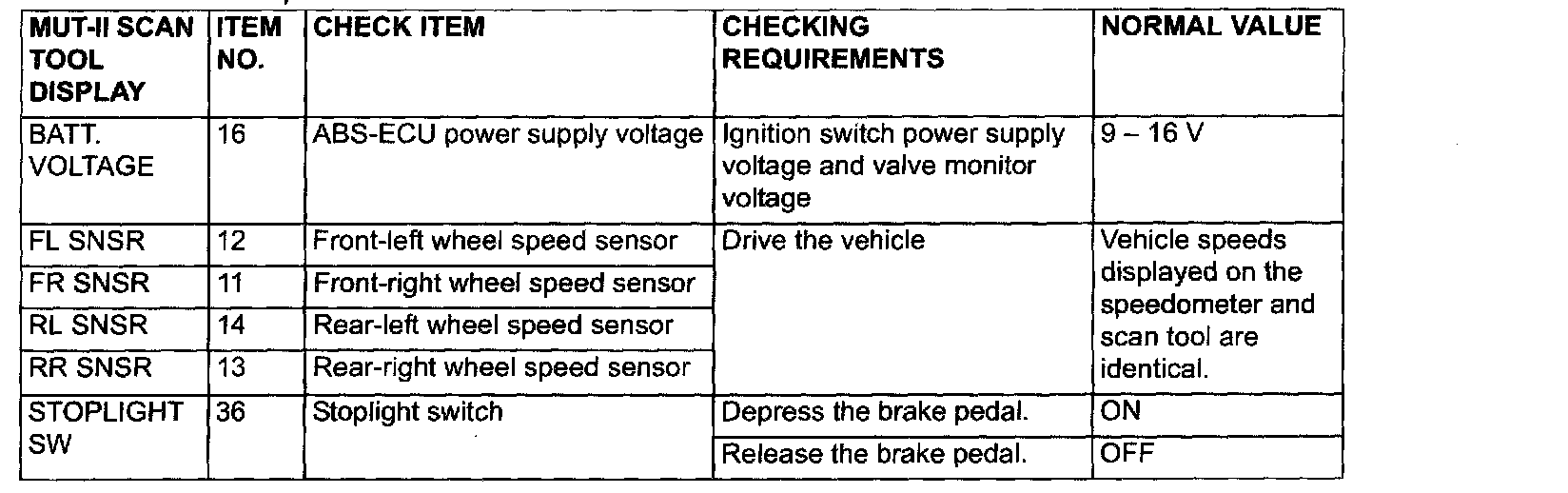 The following items can be read by the scan tool from the ABS-ECU input data.