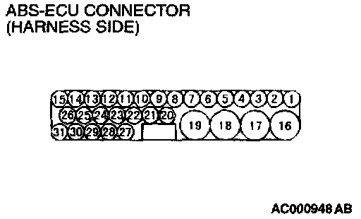 2. Disconnect the ABS-ECU connector, and then use special tool MB991219 to measure the output voltage at the harness side connector