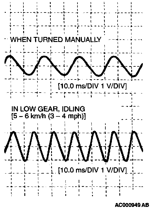NOTE: The output waveform is low when the wheel speed is low. Similarly, it will be higher as the wheel speed increases. Waveform may also be observed by driving the vehicle.