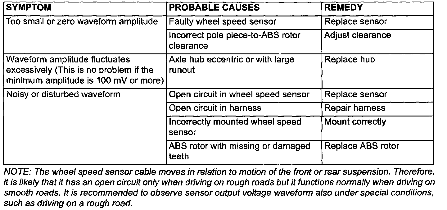 NOTE: The wheel speed sensor cable moves in relation to motion of the front or rear suspension. Therefore, it is likely that it has an open circuit only when driving on rough roads but it functions normally when driving on smooth roads. It is recommended to observe sensor output voltage waveform also under special conditions, such as driving on a rough road.