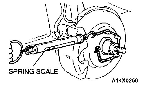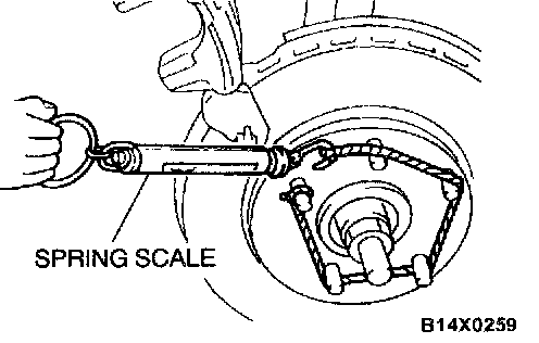 3) Use a spring scale to measure the hub torque in the forward direction. Record hub torque with pads removed.