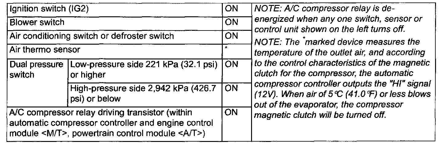 - When the air thermo sensor is activated, the dual pressure switch is ON, and the ignition switch, blower switch, and air conditioning switch are ON, the A/C compressor relay is energized.