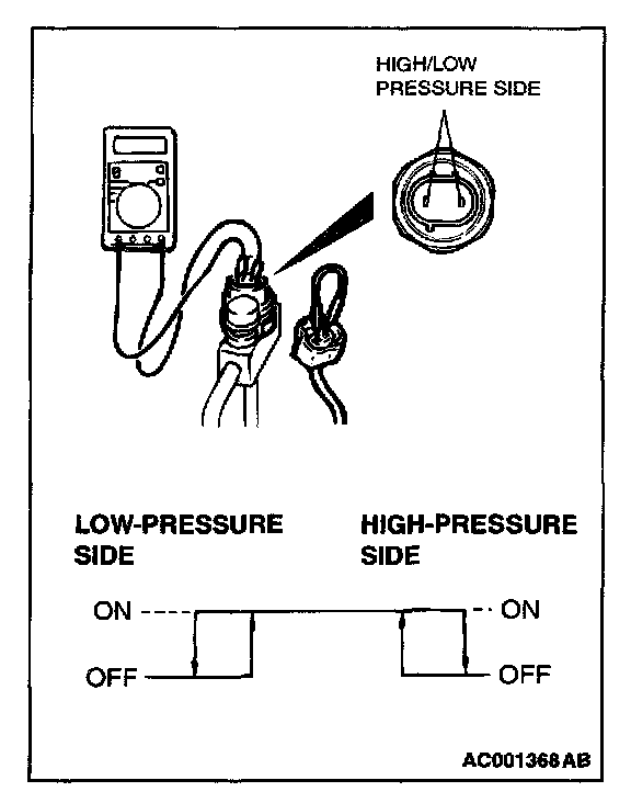 3. When the high/low pressure sides of the dual pressure switch are at operation pressure (ON) and there is continuity between the respective terminals, then the condition is normal. If there is no continuity, replace the switch.