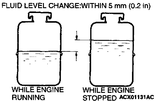 3. Check the fluid in the oil reservoir for foaming or milkiness. Check the difference of the fluid level when the engine is stopped, and while it is running. If the change of the fluid level is 5 mm (0.2 inch) or more, air bleeding should be done.
