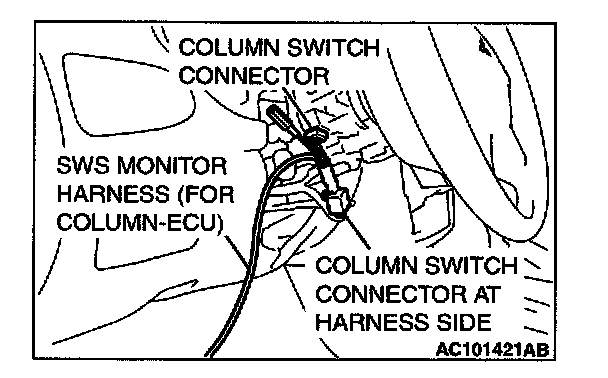 HOW TO CONNECT SWS MONITORCAUTION: Always turn the ignition switch to the "LOCK" (OFF) position before connecting or disconnecting the SWS monitor kit and scan tool MB991502.