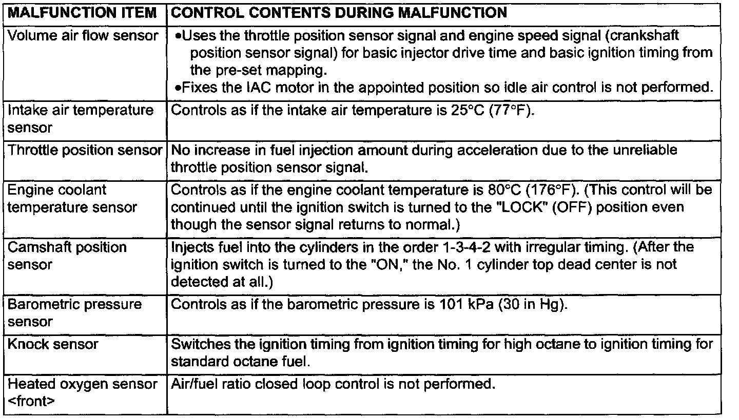 When the main sensor malfunctions are detected by the diagnostic test mode, the vehicle is controlled by means of the defaults.