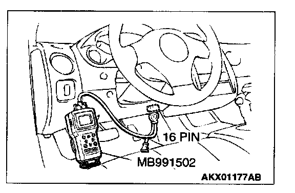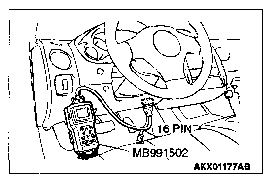 CAUTION: To prevent damage to scan tool MB991502, always turn the ignition switch to the "LOCK" (OFF) position before connecting or disconnecting scan tool MB991502.