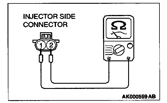 2. Measure the resistance between each injector side connector terminal 1 and 2.