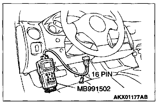 CAUTION: To prevent damage to scan tool MB991502, always turn the ignition switch to the "LOCK" (OFF) position before connecting or disconnecting the scan tool MB991502.
