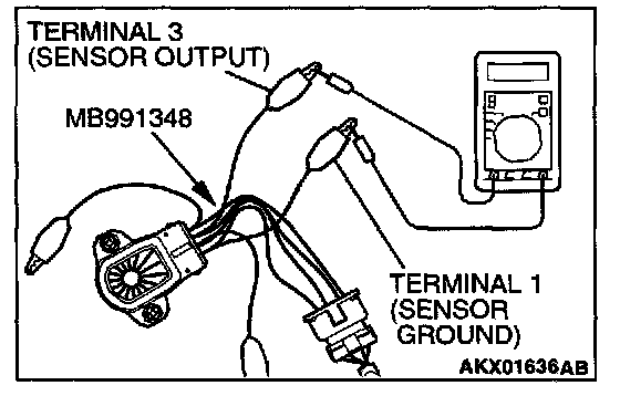 2. Connect a digital voltmeter between throttle position sensor terminal 3 (sensor output) and terminal 1 (sensor ground).