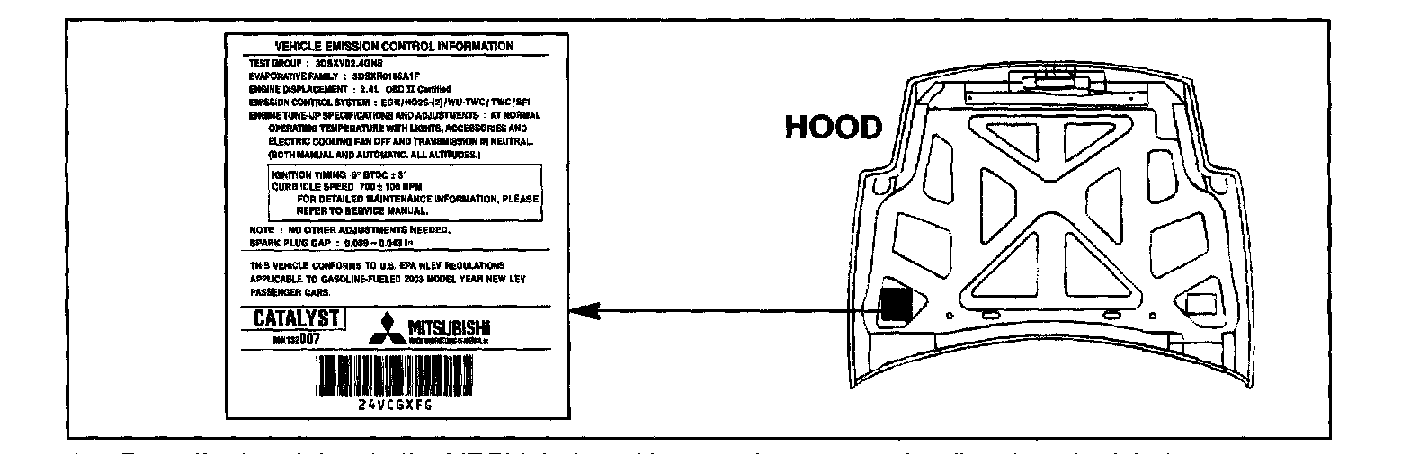 The Vehicle Emission Control Information (VECI) label on a limited number of 2003 model year FED - National Low Emission Vehicle (NLEV) emissions certified Eclipse and Eclipse Spyder vehicles equipped with the 2.4L, I4 engine is incorrect and must be changed. The original label states that the vehicle is certified both for FED and California, when in fact the affected vehicles are FED (NLEV) certified only. These vehicles cannot be sold in California or in the northeastern states which require the sale of California certified vehicles. A letter, with label enclosed, is being sent to all owners of affected vehicles instructing them to install the VECI label themselves. A copy of the customer notification letter is included with this bulletin. Vehicle owners who do not want to install the label are advised to ask their Mitsubishi Motors dealer to install the label at no charge.