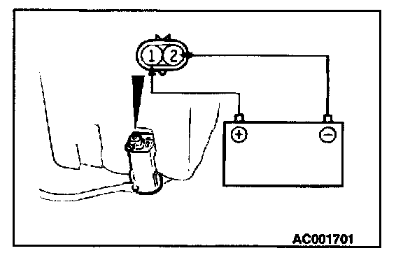 2. Check that water is sprayed out strongly when battery voltage is applied to terminal (1) and terminal (2) is grounded.