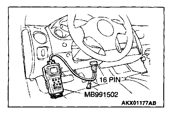 CAUTION: To prevent damage to scan tool MB991502, always turn the ignition switch to the "LOCK" (OFF) position before connecting or disconnecting scan tool MB991502.