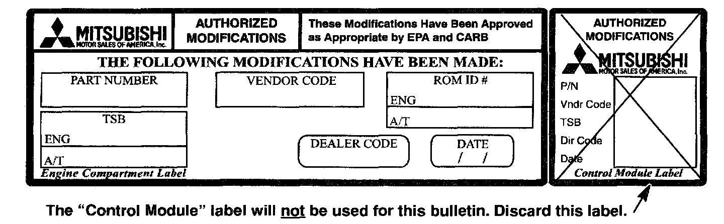 17. Using a ball-point pen, enter the appropriate PCM part number, vendor number, ROM ID #, this TSB number TSB-03-13-002), your dealer code, and the current date on the Engine Compartment Label (part no. MSSF-024G-00).