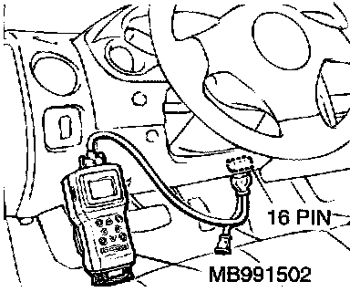 CAUTION: To prevent damage to scan tool MB991502, always turn the ignition switch to the "LOCK" (OFF) position before connecting or disconnecting scan tool.